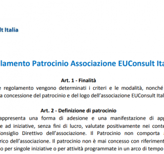EUConsult Italia ha approvato, dopo il Regolamento per l’uso del proprio logo, anche il Regolamento per la richiesta di patrocinio. I regolamenti sono in linea con quelli dell’associazione “mamma” EUConsult Europe. Lo trovate qui https://www.euconsultitalia.org/wp content/uploads/2017/09/Regolamento_richiesta_patrocinio_Associazione_EUConsult_Italia.pdf