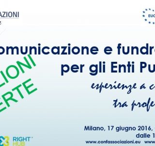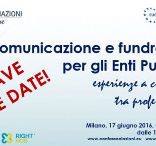 Save the date!! Confassociazioni Terzo Settore ed EUConsult Italia, presentano: “Comunicazione e fundraising per gli Enti Pubblici: esperienze a confronto”. Dall’università al comune, dal museo all’ospedale, dal liceo all’area archeologica: confronto sui temi della comunicazione e della raccolta fondi. Milano, Casa dei Diritti, 17 giugno 2016 A breve programma e modalità per la partecipazione. Evento […]